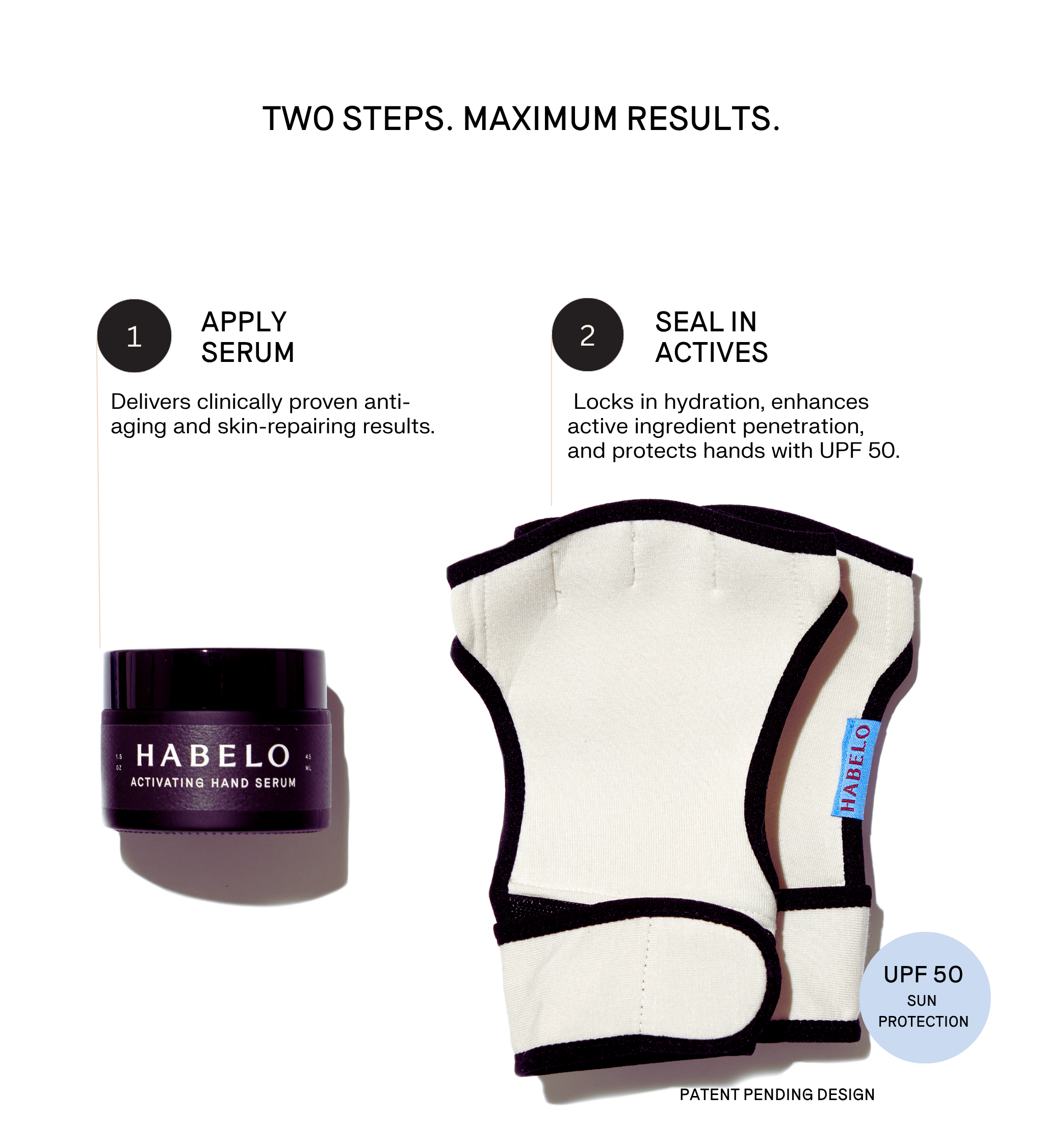 "A hand serum that plumps without damaging coupled with an exclusive glove that increases efficacy plus protects you from the sunâa must-have.â