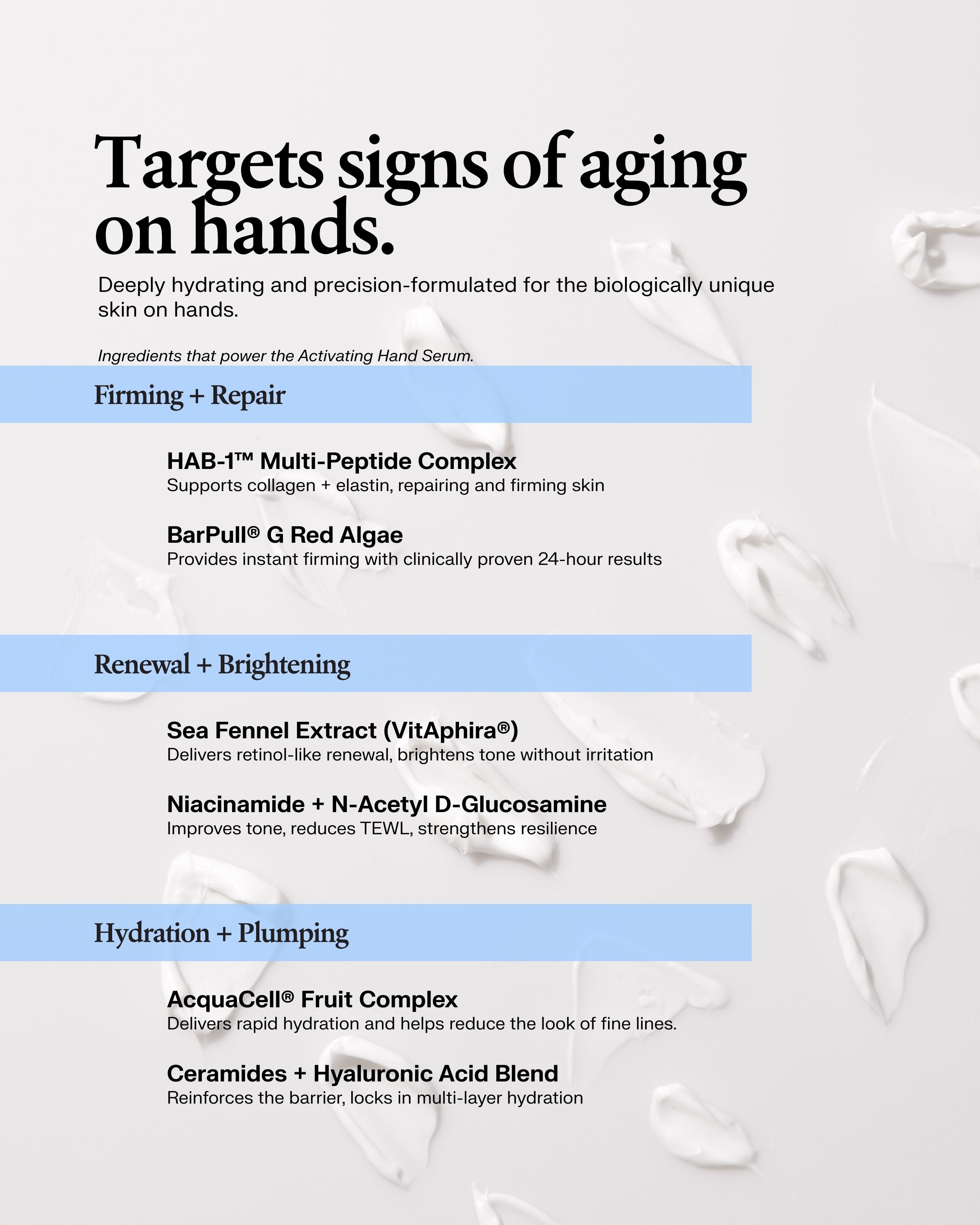 Your hands are constantly in the spotlight, showing signs of aging faster than any other part of your body. The Activating Hand Serum rewrites this narrative with cutting-edge science and high-performance ingredientsâbecause your hands deserve the best.