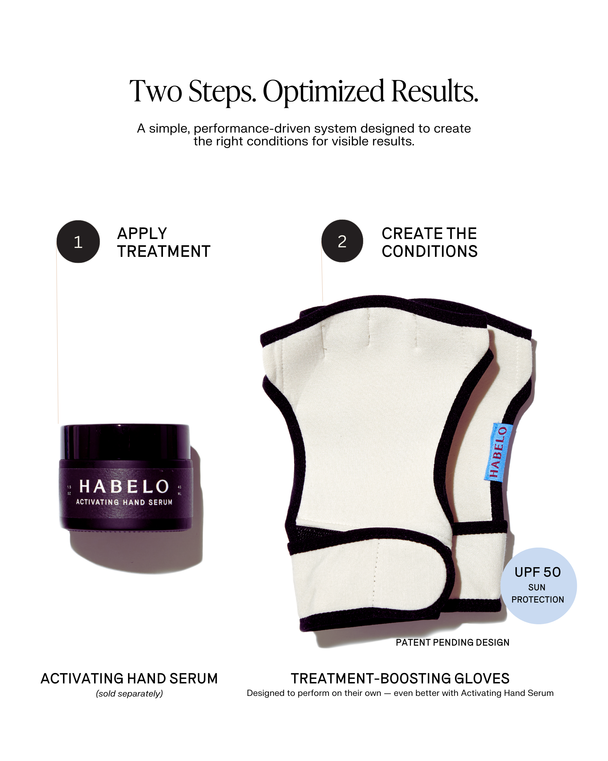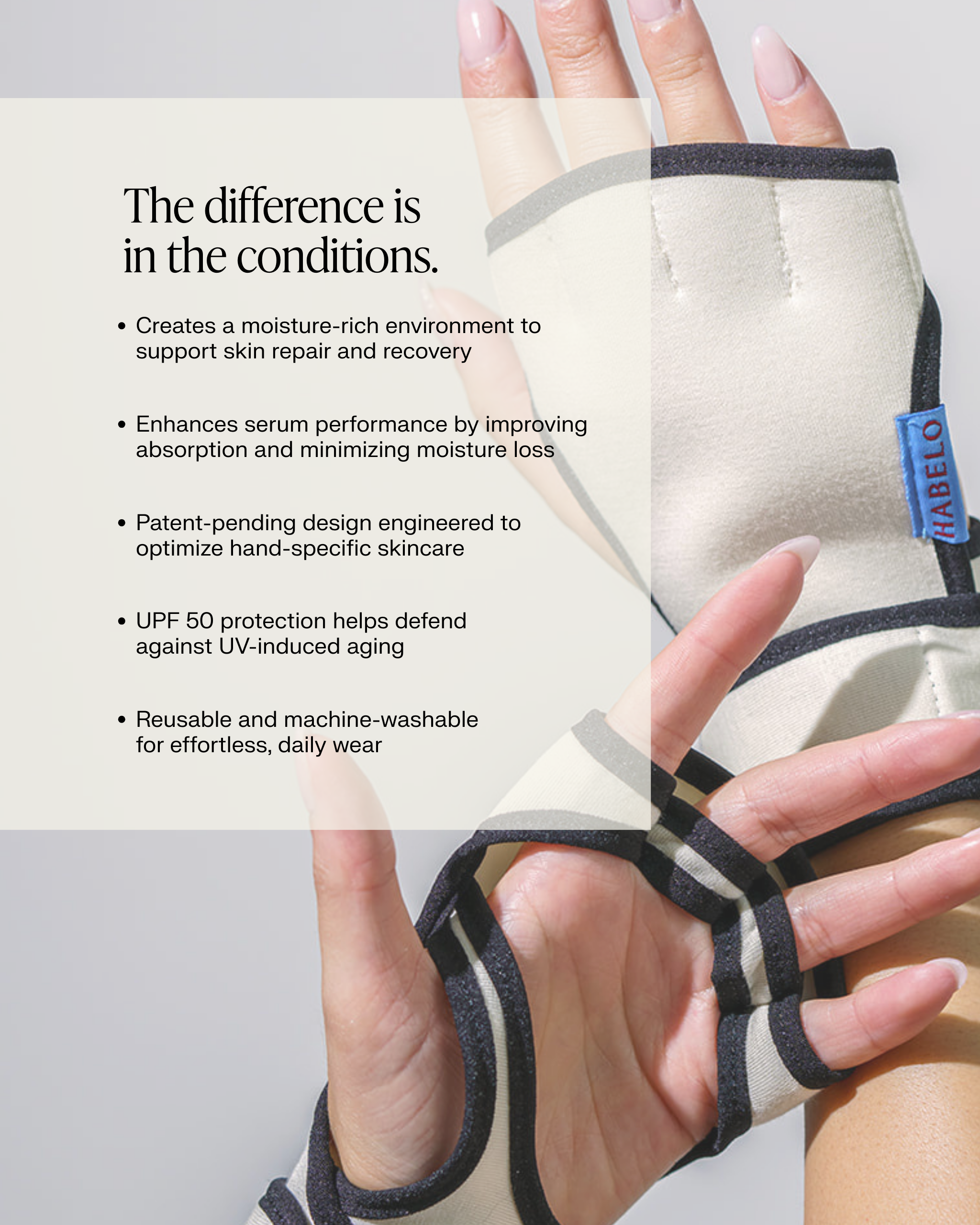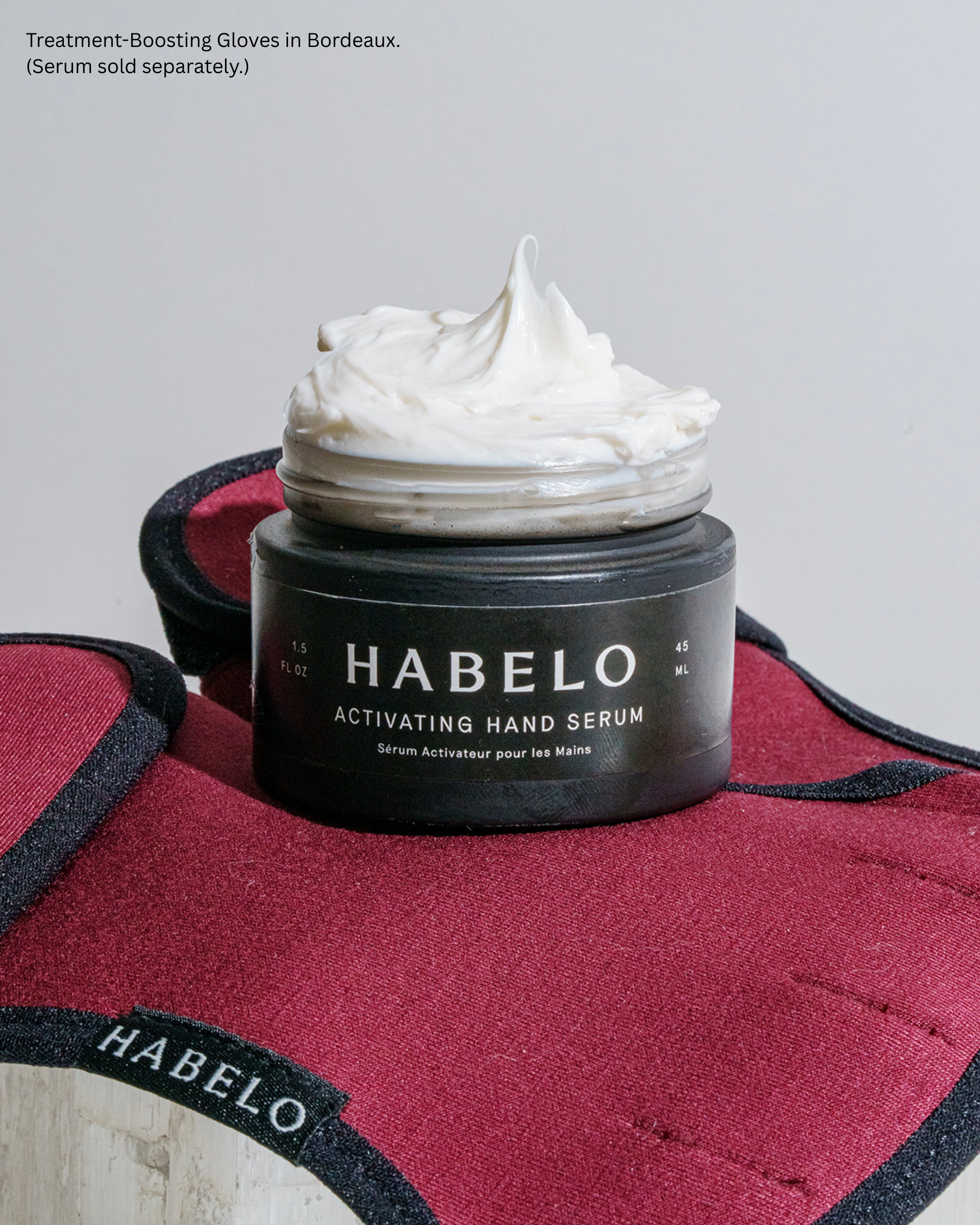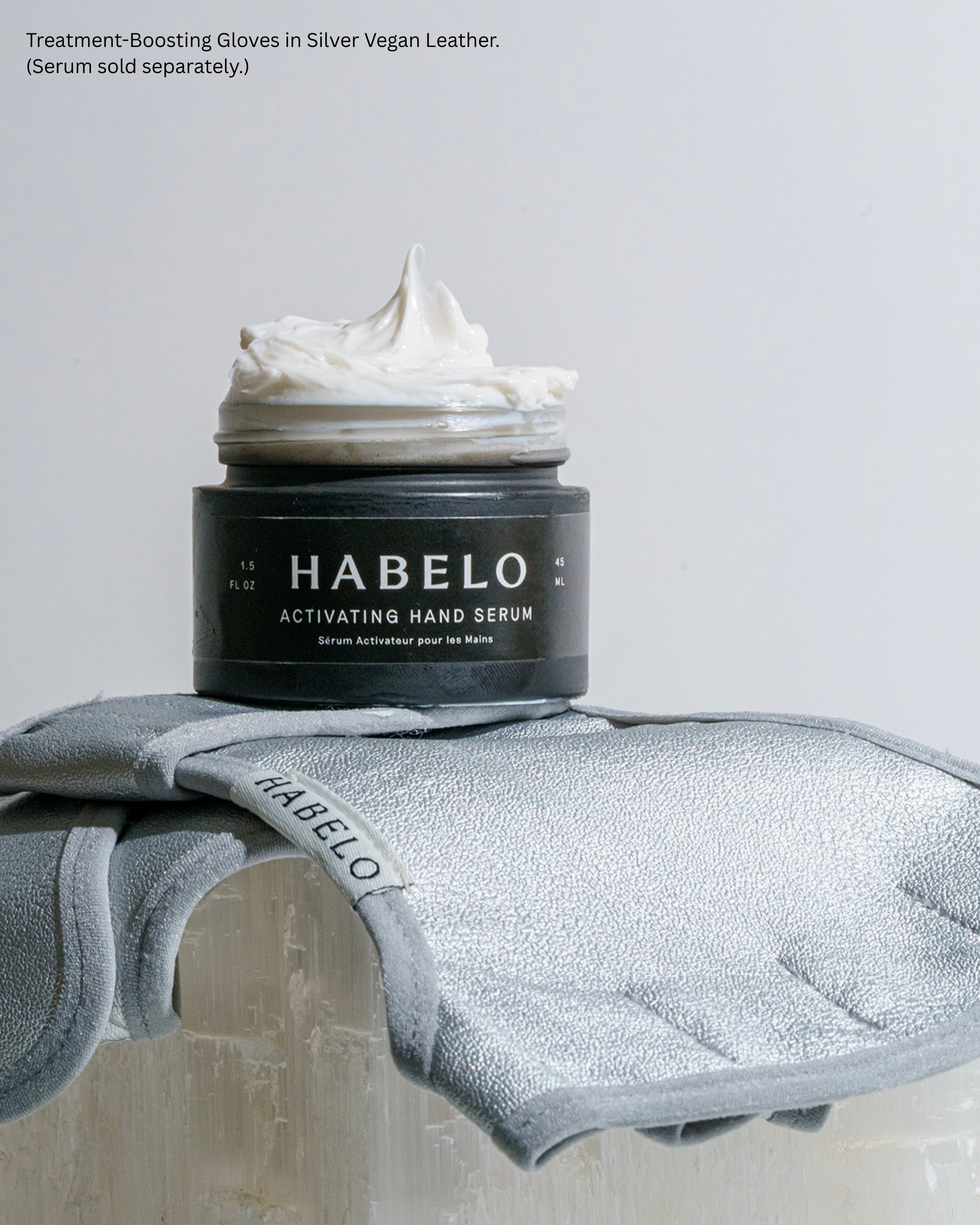 Apply a light layer of Habelo Activating Hand Serum to the backs of hands (optional but recommended). Slip on the Treatment-Boosting Gloves to create a moisture-rich environment that supports absorption and visible renewal.